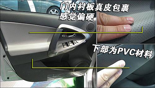 門(mén)內(nèi)扶手為皮革包裹,但感覺(jué)偏硬。門(mén)內(nèi)襯板為塑料材質(zhì)。