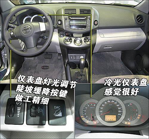 豐田國產RAV4凸顯出該車的運動風格,在內飾設計上采用深色設計。兩小一大的冷光儀表盤,感覺很舒服,駕駛員可以查看比較輕松。儀表盤燈光調節、陡坡緩降按鍵位于方向盤左側,用料感覺相對比較精細。