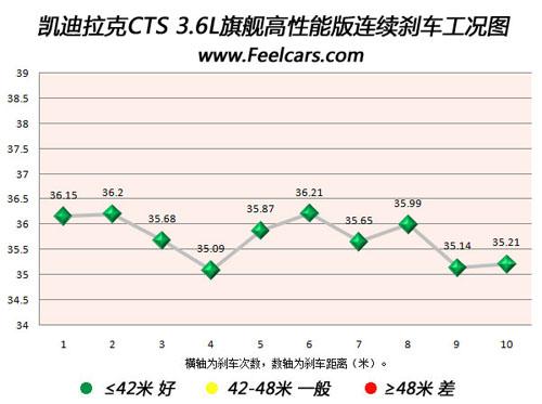 再來看看新CTS的連續10次剎車成績,最差成績為36.21米,與最好成績差距僅為1.1米,且大部分成績均在36米以內,說明新CTS的剎車系統散熱效果非常好,始終保持在最佳的工作狀態,沒有出現熱衰減現象。