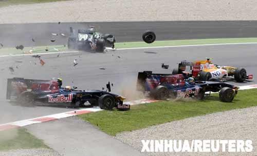 5月10日,紅牛二隊(duì)車手布爾代(前中)和隊(duì)友布埃米(前左)以及印度力量車隊(duì)車手蘇蒂爾(后)、雷諾車隊(duì)車手皮蓋駕駛的賽車發(fā)生碰撞。當(dāng)日,F(xiàn)1西班牙大獎(jiǎng)賽落幕,布朗GP車隊(duì)的英國(guó)車手巴頓奪得冠軍。新華社/路透