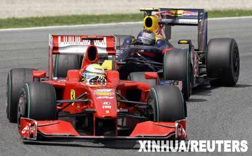 5月10日,法拉利車隊車手馬薩(前)與紅牛車隊車手維泰爾駕駛的賽車在比賽中。當日,F1西班牙大獎賽落幕,布朗GP車隊的英國車手巴頓奪得冠軍。新華社/路透