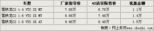 目前北京地區4S店主要賣的是C2運動版VTS車型,購車的消費者不僅可以享受到最高1.5萬元的現金優惠,而且還能得到商家隨車贈送的部分車內裝飾。目前C2運動版VTS主要有紅色、黑色等款,顏色和車型并不是很全,個別款需要預訂,其余車型均沒有現車銷售。