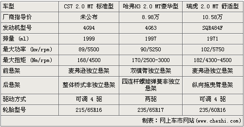 在動(dòng)力方面,三款車中獵豹只有2.0L排量可選,而哈弗有2.0L、2.4L以及2.8T柴油可選,而瑞虎也有1.6L、1.8L和2.0L 可以選擇,以2.0L的動(dòng)力對(duì)比來看,瑞虎的SQR484F發(fā)動(dòng)機(jī)從數(shù)據(jù)上看最為強(qiáng)勁,而哈弗H3的4G63在低速扭矩方面具有優(yōu)勢(shì)。在懸架系統(tǒng)方面,三款車中CS7采用了偏重越野的整體橋式后懸掛,但舒適性上不如另兩款車型。