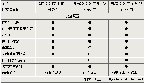在安全配置,三款車都標配前排雙氣囊、ABS+EBD、側門防撞梁等安全裝備,但瑞虎的配置無疑是最全的,但售價要比哈弗H3貴近1.6萬元,而獵豹cs7的售價還未公布。倒車雷達、電子防盜等都為CS7標配,但前盤后鼓的剎車設計讓人有些失望。