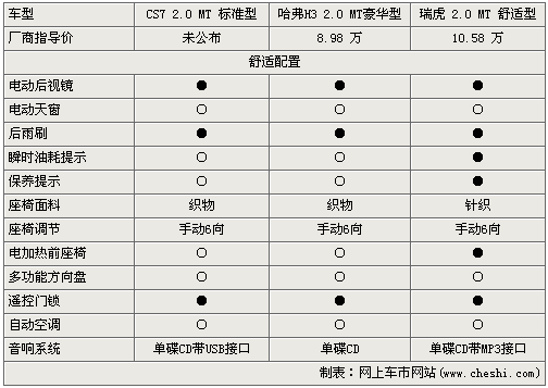 應該說,從參數配置來看,CS7在尺寸方面是三款車中最小的,由于其在越野車領域多年的經驗,使得其在越野方面有些優勢,但配置上無疑瑞虎是最齊備的,但售價也比較高,而哈弗H3則非常的大氣,并且入門級售價也只有8.98萬。因此,三款越野車您到底選擇誰還需認真抉擇!