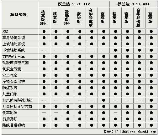 國產(chǎn)漢蘭達(dá)的安全配置還是比較齊全的,所有車型都配備的ABS、EBD、車身穩(wěn)定系統(tǒng)、7安全氣囊等裝備,尤其是車身穩(wěn)定系統(tǒng)已經(jīng)成為了漢蘭達(dá)的標(biāo)準(zhǔn)配置,該項配置可以大大提高車輛行駛中的安全性能。漢蘭達(dá)3.5排量的車型在配備了上坡輔助系統(tǒng)的同時,還配備了下坡輔助系統(tǒng),大大提高了該車的越野性能。頂配車型上還配備了擋風(fēng)玻璃除冰功能,這是該級別車型中很少見到的。