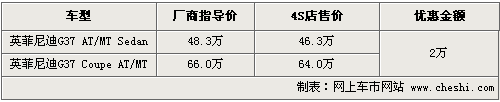 筆者從英菲尼迪北京地區經銷商處了解到,目前英菲尼迪G37銷售的車型包括四門版和兩門版車型,售價為48.3萬和66萬,F在消費者購車的話可以優惠2萬元的現金,優惠后售價為46.3萬元。這款車有銀色、黑色、紅色、白色/藍色等可提供給消費者選擇,購車的消費者可到店具體咨詢。