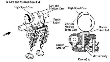 低、中轉(zhuǎn)速時(shí),凸輪軸上只有小角度的凸輪有頂?shù)綋u臂