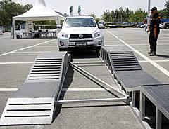 在模擬坑洼路段高低錯落的路面時,通過車輪離地和懸掛扭曲的狀況,可以明顯能感覺到RAV4車身十足的剛性。在一個車輪懸空時,主動扭矩分配4輪驅動系統自動分配動力輸出到著地的車輪,保證車輛正常行駛。此外,可人工控制的差速鎖配合AUTO LSD限滑差速鎖,RAV4在開過這些障礙物時幾乎沒有停頓。