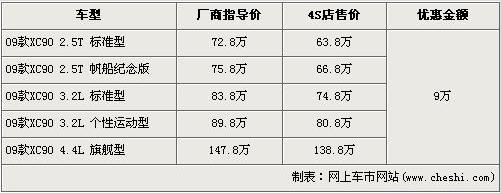 據沃爾沃經銷商處銷售人員介紹,目前店內的09款XC90車型全系都有9萬元的現金優惠,并且此次優惠活動截止到7月1日。經優惠后,2.5T標準型的售價跌破70萬元,僅售63.8萬元。2.5T 帆船紀念版經9萬元優惠后,售價從75.8萬元下降到了66.8萬元。兩款3.2L排量車型經優惠后售價降為74.8萬元及80.8萬元,頂配的4.4L旗艦車型售價降為了138.8萬元。銷售人員還介紹,XC90全系車型齊全,消費者挑選的空間較大。