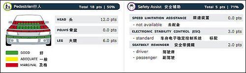 上圖描述的是車輛對于路人的保護情況和安全輔助設備配置情況。路人安全在歐洲已經普遍重視,很多檢測項目已經有了很清晰的標準。圖中看出,高爾夫6代翼子板部分對行人傷害是比較重的。在安全配置方面,高爾夫6代標配了ESC,也就是我們國內常說的ESP,不知道國產版本會不會“偷工減料”。駕駛席和副駕駛的安全帶提醒裝置都為高爾夫6代的最終成績做了加分。