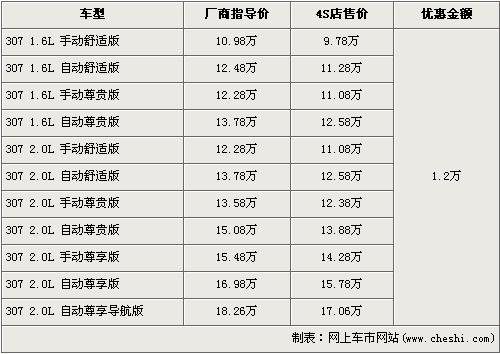 三廂標致307分為1.6L和2.0L兩種排量,同樣也優惠1.2萬元,入門車型的1.6L 手動舒適版原廠商指導價為10.98萬元,經優惠后僅售9.78萬元,排量稍大的2.0L排量的低配車型2.0L 手動舒適版售價也再次下落,優惠后的售價為11.08萬元。現車方面,1.6L車型現車充足,2.0L車型則現車緊張,挑選空間不大。