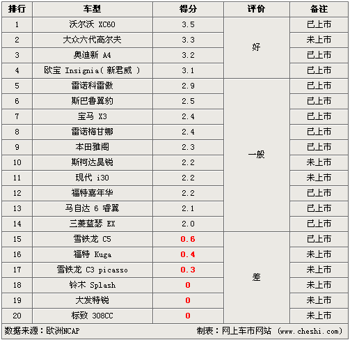 從上圖中的歐洲NCAP測(cè)試統(tǒng)計(jì)中可以看出,以安全著稱的沃爾沃確實(shí)有實(shí)力,XC60以3.5的高分位列第一名,緊隨其后的大眾新高爾夫和奧迪新A4,歐寶Insignia(即新君威)也獲得了3.1分,四款車都獲得了好的評(píng)價(jià),其中除了新高爾夫即將國(guó)產(chǎn)之外,其他三款都已在國(guó)內(nèi)市場(chǎng)銷售。有好的就有差的,即將國(guó)產(chǎn)的雪鐵龍C5僅獲0.6分,而鈴木Splash、大發(fā)特銳、標(biāo)致308CC意外的評(píng)為零分,在碰撞中毫無(wú)保護(hù)可言甚至可能會(huì)對(duì)頸部造成危險(xiǎn),而鈴木Splash還將在昌河鈴木投產(chǎn),不知到時(shí)能否獲得改進(jìn)。