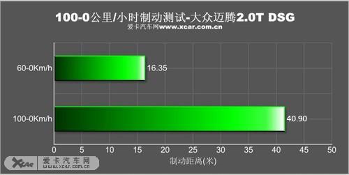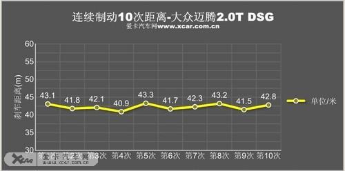 接下來的十次連續剎車測試中,新邁騰的剎車系統又表現出它穩定的一面。高強度的連續測試,剎車系統依然可靠,并沒有出現明顯的熱衰退現象,最后兩次剎車也將成績保持在43米之內。出現在第四次測試的最好剎車成績也鎖定在40.90米,良好的剎車品質更讓人信賴,相信在換上更寬的輪胎后,成績肯定會再次提高。