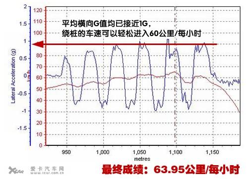 從曲線圖中我們可以看出,邁騰的平均橫向G值均已接近1G,繞樁的車速可以輕松進入60公里/每小時,而最終63.95公里/每小時的18米繞樁成績,再次展現出大眾PQ46平臺的強大實力。
