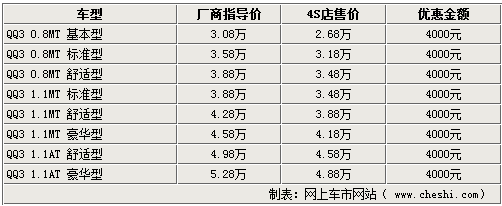 據銷售人員介紹,奇瑞QQ3系列車型比較齊全,只有1.1AMT車型現車較少。但目前QQ3全系都有一定的優惠幅度,除現車較少的車型需要提前預訂以外,全系車型均可以優惠4000元。