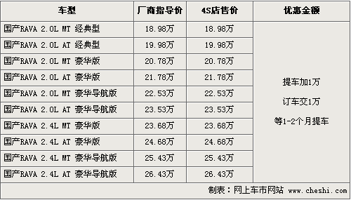 據一汽豐田4S店銷售人員介紹,目前RAV4系列2.0L貨源比較緊張,消費者需要提前預定,訂車需要等待2個月的時間,要到10月份才可以提到現車。2.4L有部分銀色現車,同時十月份將到一批黑色現車。消費者想要盡快提到RAV4時,銷售人員表示需要在原廠家指導價的基礎上加價1萬元現金,可保證消費者在9月份就可提到車。