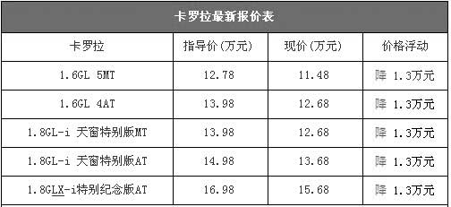 最近一段時間,卡羅拉的銷售情況一直都非常不錯,因此其價格相對來說也比較穩定。近日,我們從北京的一些一汽豐田汽車綜合經銷商處了解到,目前卡羅拉可優惠1.3萬元,比9月份的價格下降了3000元,和其歷史最低價已經非常接近。以下是卡羅拉部分車型最新報價表: