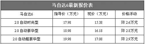 馬自達6是一款非常經典的車型,現在更是憑借著突出的性價比持續熱銷。昨日,我們從北京地區的一些一汽馬自達汽車綜合經銷商處了解到,近期馬自達6的價格穩定,降幅在2.8萬元左右,其中馬自達6 2.0自動時尚型目前的售價為15.38萬元,性價比非常不錯。以下是馬自達6最新詳細報價表: