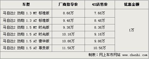 據(jù)4S店銷售人員介紹,三廂優(yōu)惠幅度為1萬元,據(jù)銷售人員介紹,選購馬2的消費(fèi)者多數(shù)選擇2廂車,而三廂在性價(jià)比上更超值。目前豪華版和時(shí)尚版有現(xiàn)車供應(yīng),入門車型優(yōu)惠后僅為7.68萬。