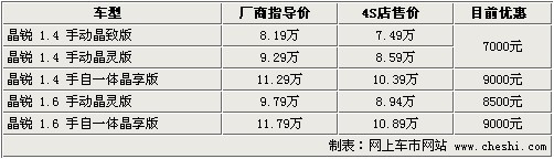 據(jù)4S店銷售人員介紹:目前晶銳全系最高優(yōu)惠達(dá)9000元,最低僅售7.49萬。晶銳目前各店內(nèi)現(xiàn)車較少,只有個(gè)別車型有現(xiàn)車,如需預(yù)定需等待1個(gè)半月時(shí)間。價(jià)格方面,如到店內(nèi)洽談可獲得更高優(yōu)惠。1.4升手動(dòng)車型優(yōu)惠幅度,由原來的6000元增至7000元,而1.4升與1.6升自動(dòng)擋車型已優(yōu)惠9000元,相比之前的6000元增幅達(dá)33.3%。