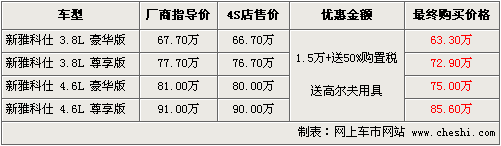 據(jù)進(jìn)口現(xiàn)代4S店銷售人員介紹,目前新雅科仕車型優(yōu)惠1.5萬元,并返還50%購置稅。返還的購置稅分別從2.9萬-3.9萬不等,其中4.6L尊享版購置稅最高返還近4萬元,最終購買價格約85.6萬元。新雅科仕最低實際購買價格63.3萬元。另據(jù)介紹,現(xiàn)購買新雅科仕還贈送高爾夫用具。如消費者有意購買,到店詳談會有更優(yōu)惠的價格。北京地區(qū)各4S店由于訂單不同,各店銷售的現(xiàn)車顏色有所不同。