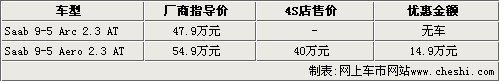 據(jù)薩博汽車4S店銷售人員介紹,薩博9-5目前現(xiàn)車比較少,而且只有9-5Aero車型可以銷售。目前購(gòu)買9-5Aero車型可以優(yōu)惠14.9萬(wàn)元,整車價(jià)格幾乎觸及底線,相比之前兩個(gè)月,優(yōu)惠幅度提高了2萬(wàn)元。另外全新薩博9-5也將在明年下半年引入國(guó)內(nèi)市場(chǎng),目前還無(wú)法接受預(yù)訂。