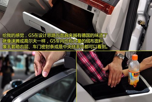 雖然總體感覺還不錯,但真正讓我們徹底認可瑞麒G5做工的還是一些細節方面的表現。首次前車門門板下端的絨面裝飾比較細膩,雖然它并沒有太多實際作用,但其意義所在就是用來提升車型的檔次感。同樣我們發現瑞麒G5在手套箱、中央扶手箱內部都鋪墊了絨面內襯,手感很有親和力。此外車門上的雙層密封絨布條也讓我們感到有些意外,這讓我們想到以做工精致著稱的大眾速騰。