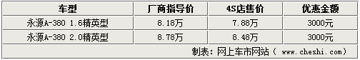 永源汽車旗下的A-380車型在經銷商處現(xiàn)可給出3000元的現(xiàn)金優(yōu)惠。經銷商表示,現(xiàn)在店內的1.6L及2.0L車型均可滿足消費者購車的需要,顏色也比較齊全。