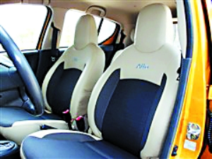 新奧拓采用了全新的中控臺設計元素,雙色內飾使整個內部空間層次分明。儀表盤的樣式很別致,在傳統的儀表盤上只有一個大大的圓形速度表盤,轉速表被單獨“提”了出來,布置在儀表臺的左上方。儀表臺、前門板以及座椅都體現了雙色風格,加上濃郁的設計元素,整個內飾空間給人一種清新明快的感覺。運用三種不同面料縫制的座椅頗具運動感,造型設計比較符合人體工程學,頭枕和椅背采用一體式設計,能貼合乘坐者的頭、背及腰部曲線以提供良好的駕乘感受。