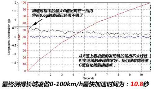 雖說從參數上看,這款GW4G15發動機的最大扭矩是出現在4000rpm左右,但在測試時編輯發現用4000rpm起步后轉速會掉的很多,沒有做到最大扭矩起步的目的。所以編輯嘗試5000rpm起步,凌傲的前輪難以避免的出現了打滑的情況,不過車身抬頭的情況并不是特別明顯,這個轉速起步后,發動機的轉速雖然也會掉,但離最大扭矩輸出的點比較靠近,所以起步效果比4000rpm還要好一點。最終凌傲0-100km/h的最好加速成績為10.8秒,這個成績在這個級別的國產車中是比較靠前的成績!
