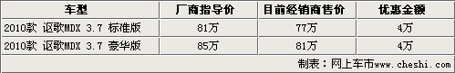 據北京地區謳歌4S店銷售人員透露,謳歌2010款MDX現車均已到店,車源比較充足。現在購車不僅可以享受到4萬元的現金優惠外,還可以得到商家贈送的原廠汽車裝飾。部分顏色車型需要提前預定,訂貨周期在一周左右。目前北京地區有三家謳歌4S店,消費者在購買前可以多去幾家4S店。