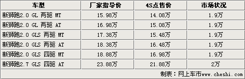 東風(fēng)悅達起亞獅跑和北京現(xiàn)代途勝屬于同平臺車型,但相比途勝,獅跑外觀更有活力。現(xiàn)售的09款獅跑,時尚的外觀和改款后配置的重新升級,使獅跑在同級別中的性價比進一步提升。近日根據(jù)網(wǎng)上車市價格監(jiān)測系統(tǒng)顯示,目前獅跑最高優(yōu)惠達到2萬元,其中2.0和2.7的四驅(qū)車型需要提前預(yù)定。具體車型售價見下表: