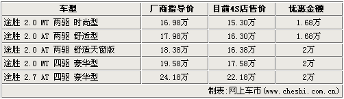 北京現代途勝是韓系車中非常經典的一款城市型SUV,寬大的空間,時尚的外觀以及人性化的配置使眾多消費者都鐘情它。據網上車市價格監測系統顯示:目前購買途勝的消費者最高可享受到2萬元的現金優惠。具體車型見下表: