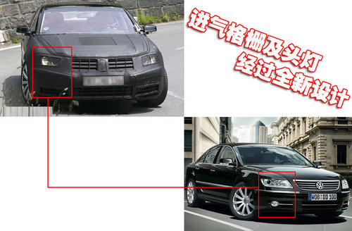 大眾新輝騰前臉采用上下分層的橫條形進氣格柵,照明燈組大量使用LED照明。從曝光的新輝騰路試諜照看,前臉應該是其改變的重點,而在側面和尾部設計上變化將不會很明顯。