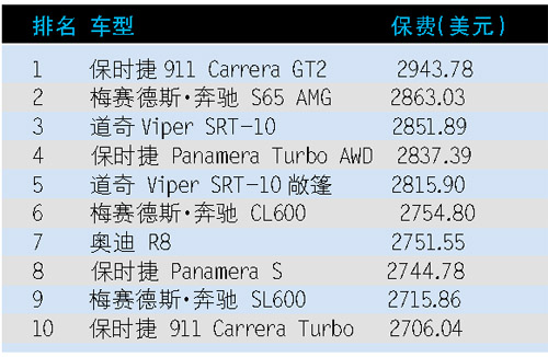 第一名跟第十名的保費差距大約也才只有240美金,而在前十名之后的11~20名中,基本上都是梅賽德斯·奔馳的天下,包括CL65 AMG、S600、SL65 AMG以及CL63 AMG都入選在內,除此之外,還有寶馬M6(硬頂及敞篷版)和760i以及兩款捷豹XKR機械增壓版本。不過,文章并沒有講明保險金額的實際保障內容是什么,所以跟國內的保費也不太好比較。可是,可以看出,榜單中的這些車輛售價也并不便宜,這點兒保費還真不算什么。(記者陳鑫欣)