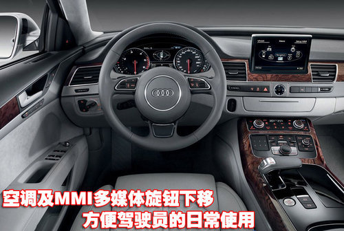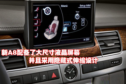 奧迪新A8配備了大尺寸液晶屏幕,并且采用隱藏式伸縮設計。除通過座椅上的按鈕調節座椅外,還可以通過液晶屏幕上的相關圖示進行坐姿選擇。除此之外,中控臺上的復古式指針石英表也凸顯了奧迪新A8的華貴。