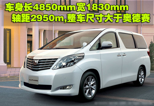 目前日本本土銷售的豐田Alphard是其第二代車型,分為兩驅和四驅兩個版本,兩驅車型的車身長4850 mm ,寬1830 mm ,高1890mm,四驅車型的車身長為4850 mm ,車寬1830 mm ,高1905mm,而軸距均為2950mm。