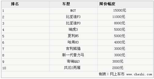 隨著國內汽車市場逐漸升溫,很多汽車品牌也開始了市場爭奪戰,很多熱門車型在進入五月份以來,都出現了較大的優惠幅度。據網上車市網站了解,很多自主品牌熱門車型在北京汽車市場已經開始出現了初步的價格戰,比如比亞迪F3、MG7等熱門車型都出現了萬元以上的優惠幅度。這對很多消費者來說算是個比較好的消息,接下來讓我們去了解一下究竟有哪些車型優惠幅度最多。