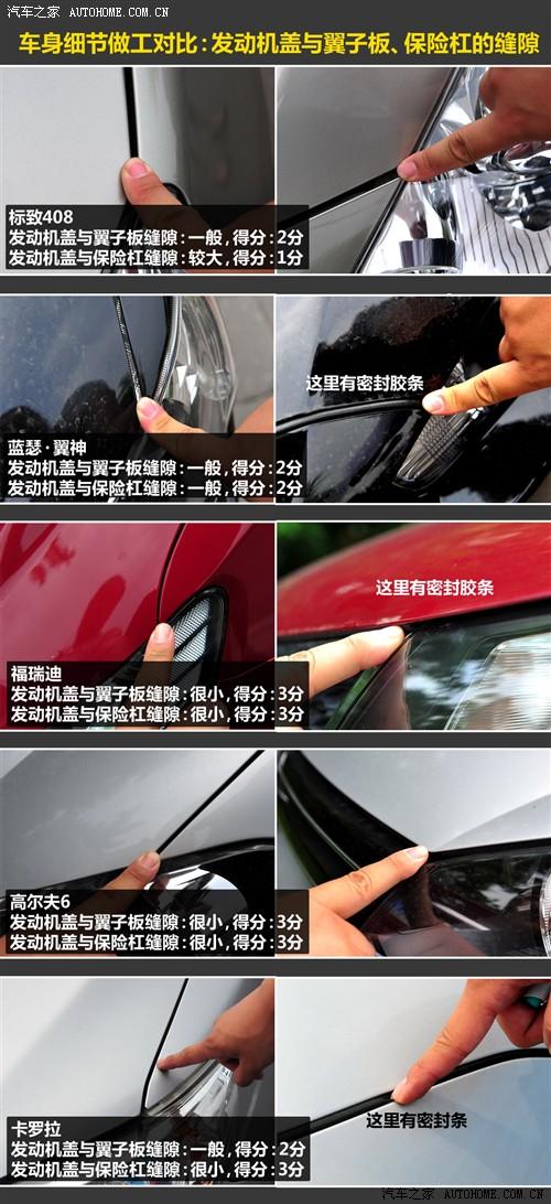 在這一環節的對比中,得分最高的高爾夫占了很大的便宜,其實是因為它采用了激光焊接的車頂,而出乎我們意料的不是高爾夫,而是福瑞迪,他的鈑金縫隙控制非常好,發動機蓋與翼子板和保險杠的接縫都非常小,在10款車中都是最小級別的。