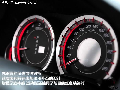 思鉑睿的儀表盤采用獨特的立體設計,速度表和轉速表都是向外凸出的,很有立體感,運動版的儀表為紅色背光,普通版為藍色。真皮包裹的檔把手感不錯,不過檔位對應不是很清晰,掛檔時最好還是看著儀表操作。