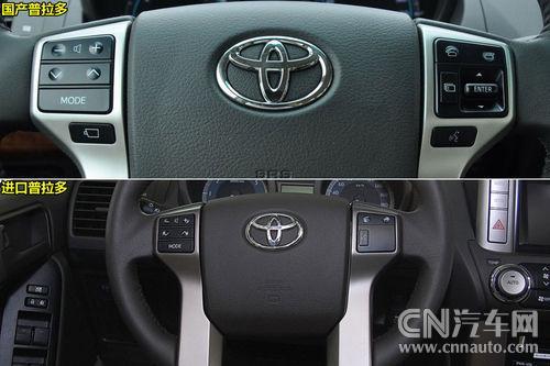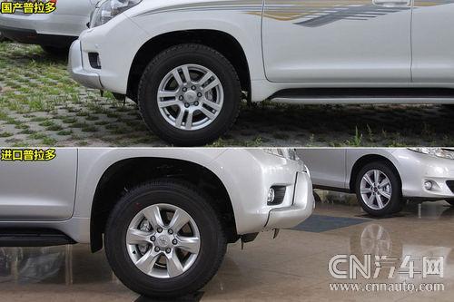功能配置差異:此外,國產(chǎn)車型增添配置了電動調(diào)節(jié)座椅,電動調(diào)節(jié)方向柱,座椅加熱功能,智能感應(yīng)鑰匙一鍵啟動系統(tǒng),電動天窗等等。普通車型音響系統(tǒng)采用6碟CD和9個揚聲器,而兩款NAVI車型則采用了更高的6碟DVD和14揚聲器配置。不同于進(jìn)口車型的265/65R17輪胎,國產(chǎn)高配VX車型配置更加美觀的18寸五輻條雙叉臂鋁合金輪轂和265/60R18鄧祿普GTANDTREK系列AT22輪胎。