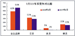 統(tǒng)計(jì)數(shù)據(jù)顯示,今年前9月,自主品牌SUV的市場(chǎng)占有率達(dá)到了58%,比起去年的48%增長了10%,其中長城和奇瑞瑞虎的銷量都在4萬輛左右,市場(chǎng)份額達(dá)到15%。