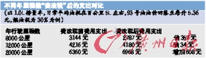 可以看出,按照現(xiàn)行油價(jià)計(jì)算,對(duì)于大部分車(chē)主來(lái)說(shuō),燃油稅率越高,所需支付的燃油部分的養(yǎng)車(chē)成本比重將更高;對(duì)于不同車(chē)型來(lái)說(shuō),排量越高,費(fèi)改稅之后所需要支出的費(fèi)用也越多;對(duì)于相同車(chē)型來(lái)說(shuō),每年行駛里程數(shù)越多,費(fèi)改稅之后所需要支出的費(fèi)用也越多。即使在燃油稅開(kāi)征后,93號(hào)油油價(jià)回落至今年年初的每升5.36元,對(duì)于一輛一年行駛10005公里、油耗在5.0L每百公里左右的1.0L排量小車(chē)來(lái)說(shuō),在費(fèi)改稅之后,還是需要多支付200多元油錢(qián)。