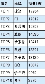 與上月相比,桑塔納和雅閣排名提前,QQ再次進入前十名,表現也較為出色。
