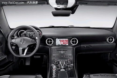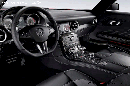 看到內飾的第一感覺就是運動感很強,無論是全黑色的真皮內飾,還有鑲嵌點綴在各處的碳纖維面板,或者是三輻、平底的真皮方向盤,像瞄準鏡一般的空調出風口等等,都毫不客氣的顯露出了SLS以運動為本的設計理念,當然,這也是在向前輩300SL致敬。