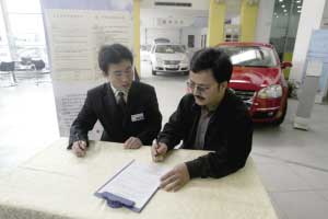 昨天上午11時許,在豐臺工商分局指導下,一位姓邱的消費者(右)與某公司簽署了本市首份《北京市汽修合同》。邱先生稱,他最擔心因修車期延時不能用車,以及修理商擅自使用汽車,現在合同里有了規定,更讓人放心