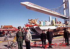 北京天安門廣場(chǎng)十月二日布置了數(shù)十輛參加五十周年國慶群眾游行的各省、區(qū)彩車,代替花壇供市民觀光,從清晨開始就許多游客在花車前留影。