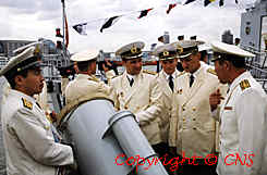 在上海訪問的俄羅斯海軍艦艇編隊官兵,十月四日在中國海軍揚子江碼頭參觀中國新型的海軍導彈驅逐艦和護衛艦。