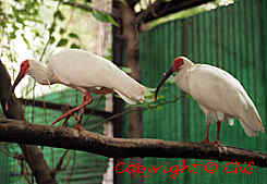 朱(擐右側(cè)加鳥)是中國最瀕危的野生動物,全世界僅存二百只左右,堪稱世界珍寶。北京動物園從八十年代中期試驗人工飼養(yǎng)繁殖,目前已發(fā)展到二十二只。其中十四歲的青青(左)和"丈夫"平平十年來年年產(chǎn)卵繁殖后代,對延襲朱(擐右側(cè)加鳥)家族貢獻巨大。